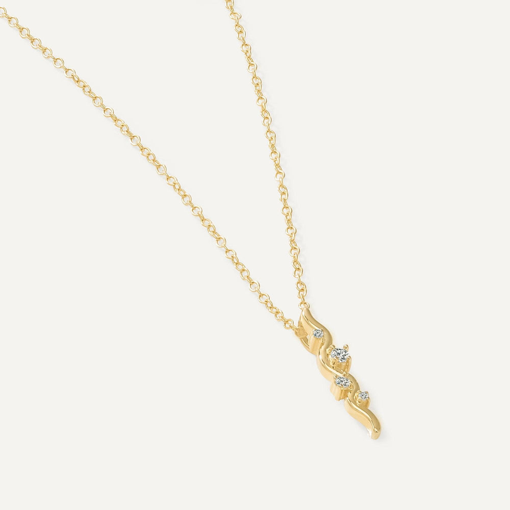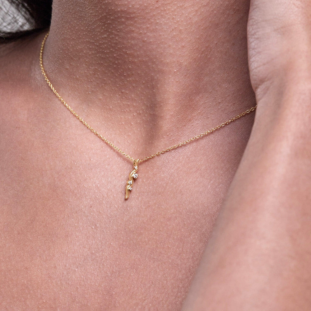 Our Stevie necklace features a pendant of winding gold around delicate diamonds.