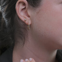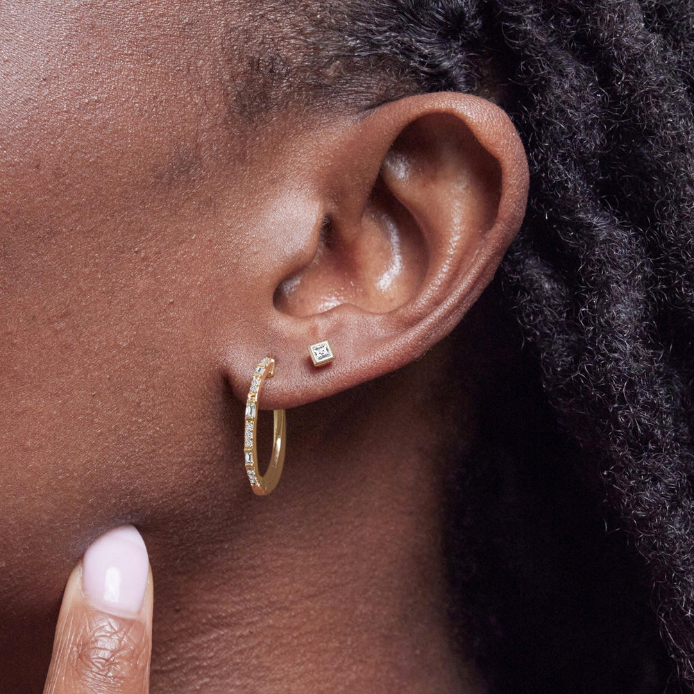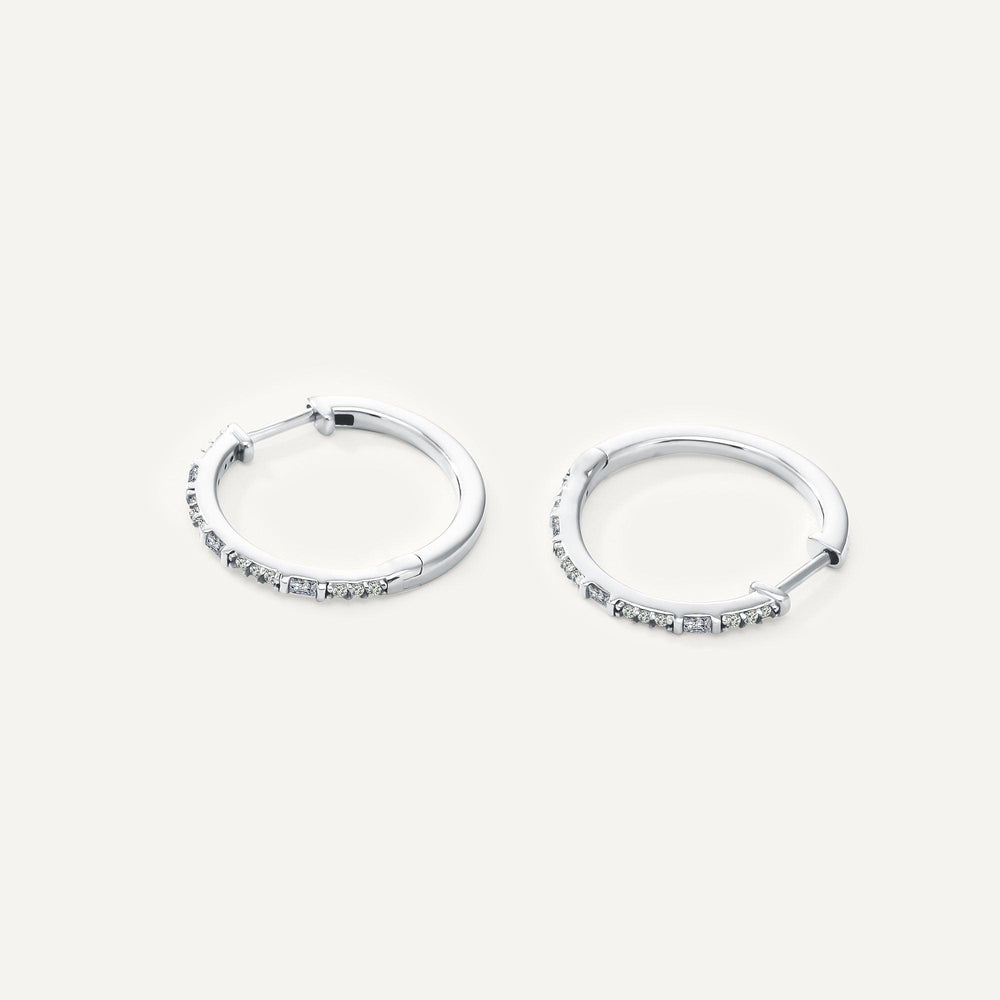 The perfect everyday hoops, our Aurora earrings feature a mix of round and baguette diamonds.