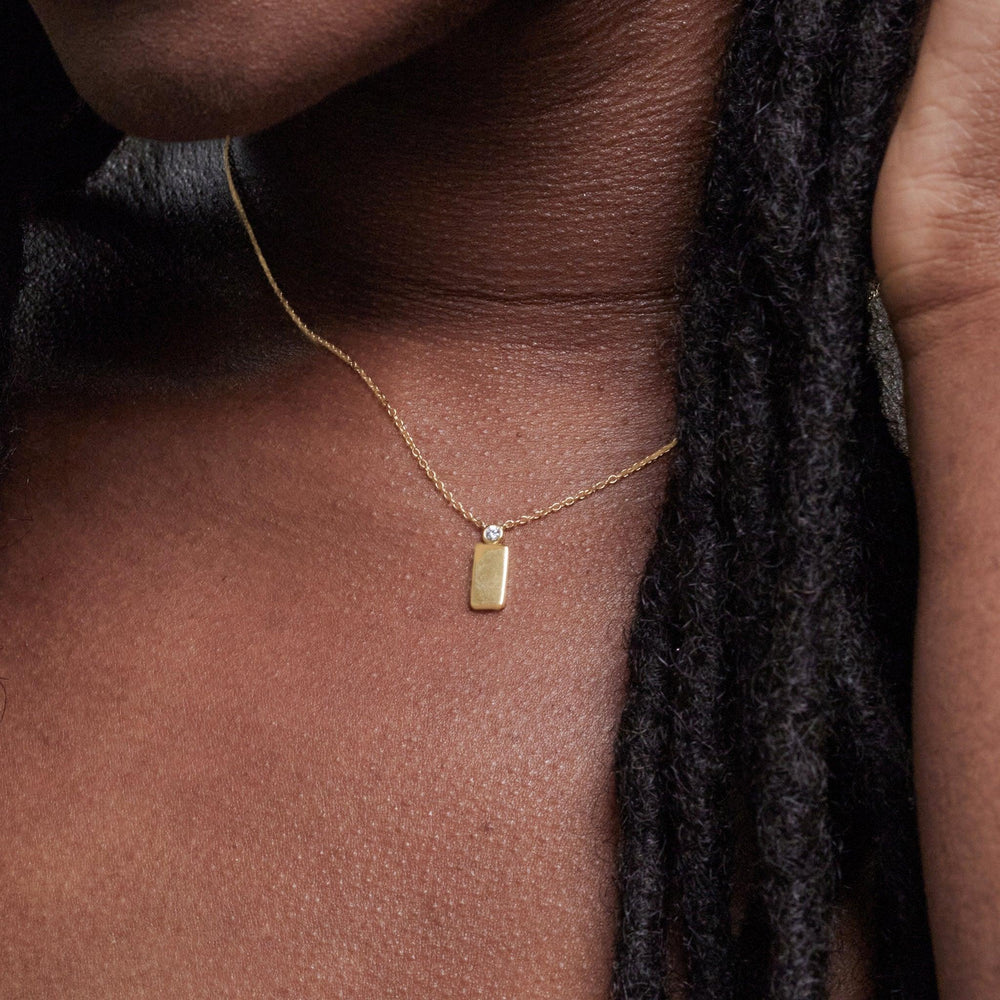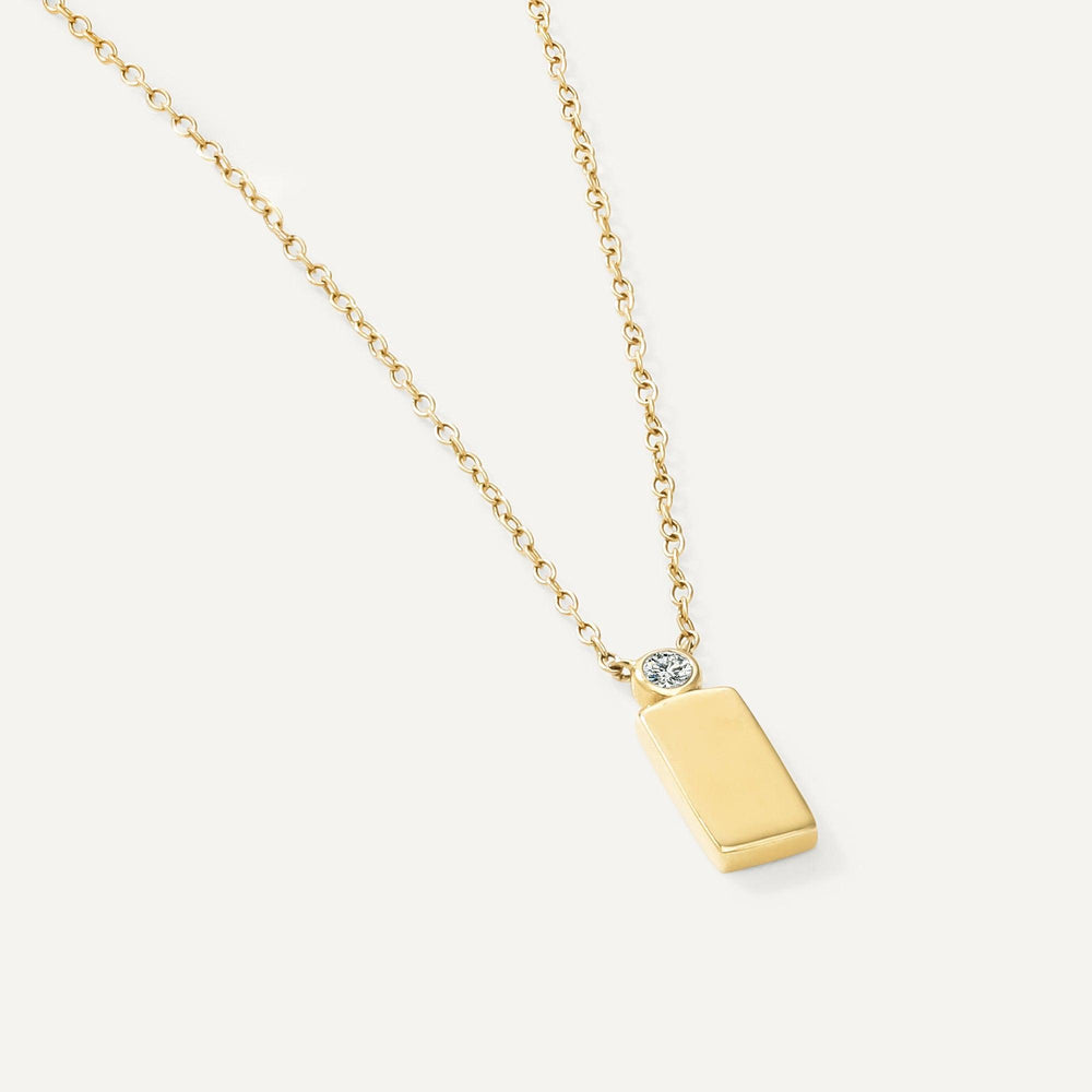 | The fine chain, diamond, and dainty polished metal Presley pendant is a simple, timeless piece that can be layered or worn on its own each day. |